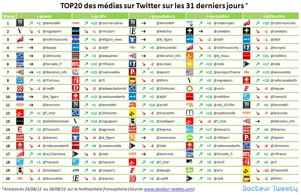 Alors que Le Monde (@lemondefr), en dépassant la barre du million de followers redevient le média le plus suivi sur Twitter, du côté de l’influence*, c’est NRJ (@NRJhitmusiconly) qui remporte la palme en grimpant de 20 places.