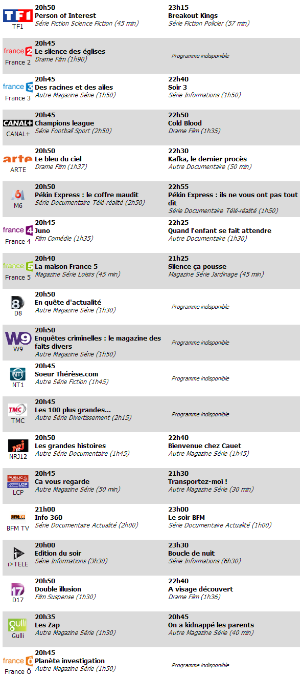 Avec infos.fr, retrouvez le programme télé de votre soirée du 10 avril 2013. À tout moment, vous pouvez retrouver le programme TV ici, avec en plus la fonction très pratique « en ce moment ».