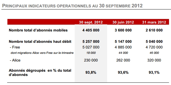 Le Groupe a maintenu son excellente dynamique de recrutement d’abonnés sur ses offres mobiles avec 805 000 nouveaux abonnés nets de résiliations, soit une part de marché de plus de 60%* sur la période sur les nouveaux abonnés. Au 30 septembre 2012, le Groupe compte 4 405 000 abonnés à ses offres mobiles, soit 6,4% du parc total.
