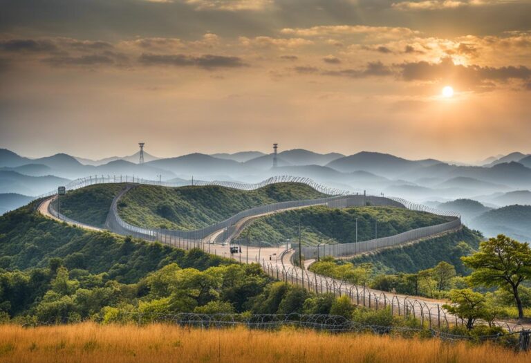 Divisées par une zone démilitarisée (DMZ) de 4 kilomètres de largeur, la Corée du Nord et la Corée du Sud sont séparées par une ligne de démarcation située en plein milieu de cette zone. Les deux côtés de la DMZ sont fortement fortifiés, tandis que la ligne de démarcation elle-même n’est marquée que par de simples panneaux.