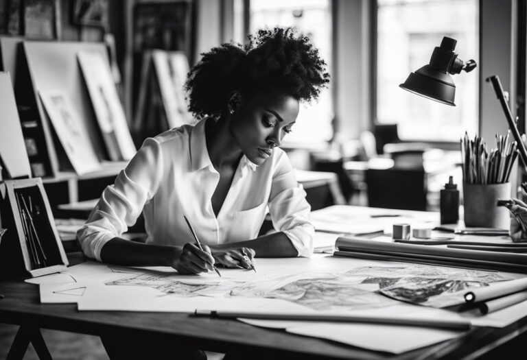 La styliste travaille dans un open space avec des murs blancs et une atmosphère de concentration, regroupant moins de vingt collaborateurs. Des vêtements sont suspendus et rangés au fond de la salle, mais ce sont surtout les livres qui attirent l’attention. Tant d’étagères remplies de livres d’art et de design, mais aussi une multitude de références à des artistes et penseurs noirs, du continent africain et de la diaspora.
