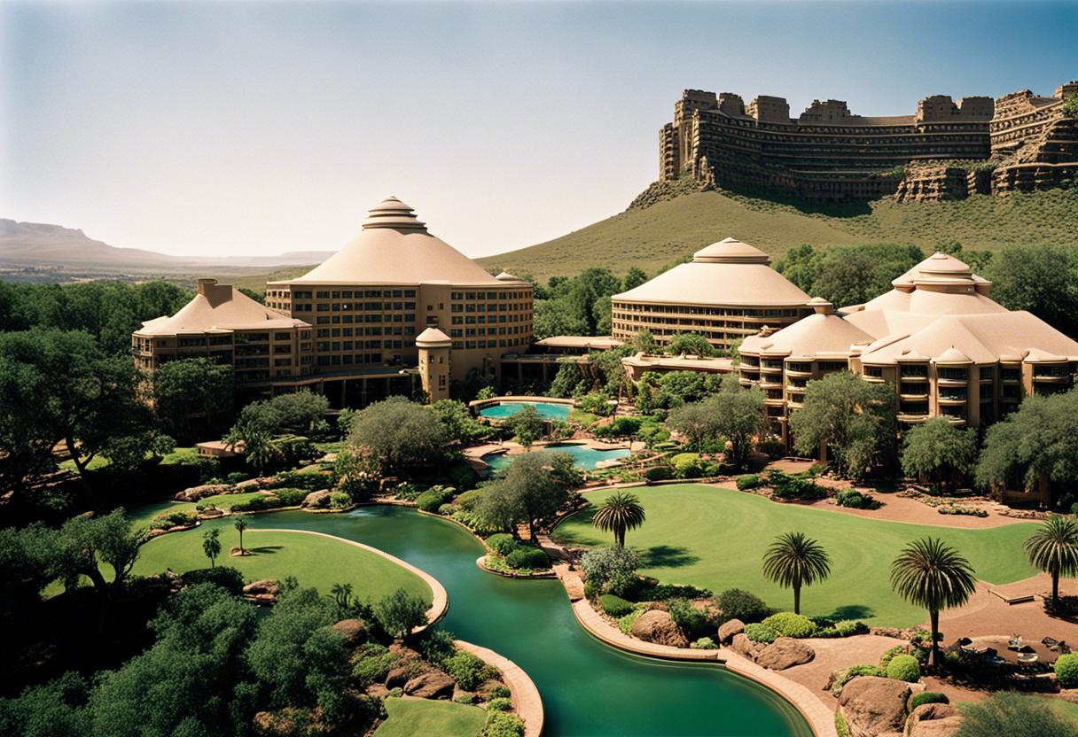 A environ 120 minutes en voiture de Johannesburg, le cœur économique de l’Afrique du Sud, se trouve Sun City. Cette station gigantesque englobe un casino, un terrain de golf, quatre hôtels supplémentaires et même une plage artificielle, se présentant comme une apparition dans le désert. Pour y arriver, il faut traverser une zone demi-aride émaillée d’sites miniers aux silhouettes métalliques fantasmales, caractéristiques de cette région du Nord-Ouest riche en diamants, en or et en platine. En approchant, les panneaux routiers annoncent la prétendue « ville ensoleillée ». Une fois sur place, le décor change complètement: une jungle créée artificiellement, traversée de cours d’eau et de cascades.