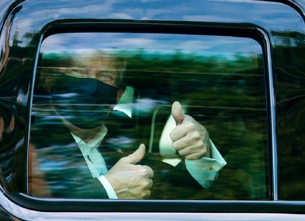 Dans une vidéo publiée sur son profil Twitter, où le président américain est toujours très actif, il avait annoncé une « petite visite surprise » à ses fans en dehors de l’hôpital, qu’il qualifiait de « patriotes avec les drapeaux qui portent mon nom, qui aiment notre pays ». Puis Trump s’est montré dans la voiture avec le masque sur le visage, en saluant la foule rassemblée à l’extérieur de l’hôpital, qui l’acclame à haute voix.