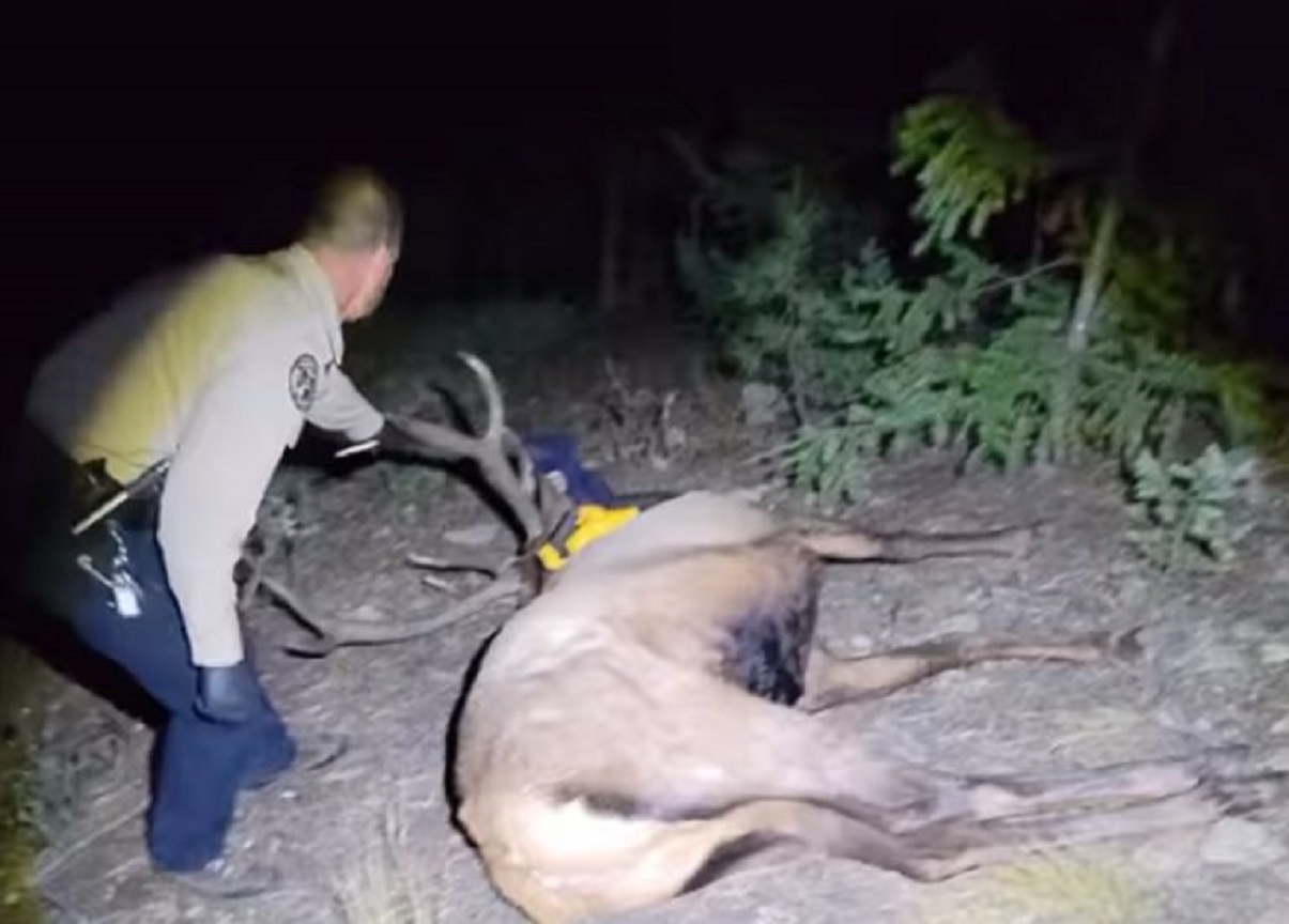 Sa punition a été allégée le samedi 9 octobre, lorsque l’ongulé a été revu dans les bois autour de Denver. À ce moment-là, l‘animal a été mis sous sédatif par des employés des Parcs et de la Faune du Colorado. C’était la quatrième fois en une semaine que les rangers tentaient d’intervenir pour essayer de capturer le grand mâle et l’aider.