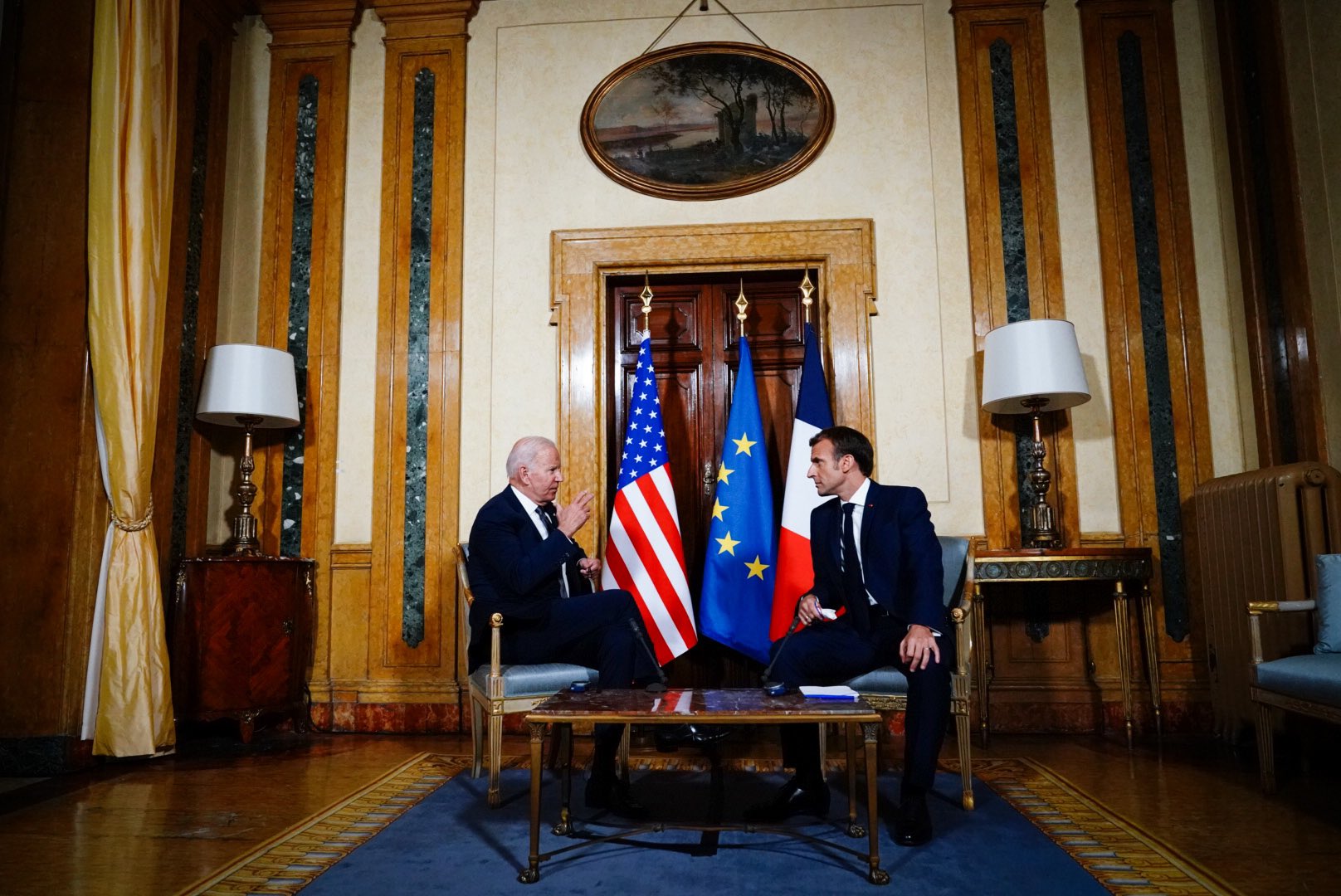 Il était important que Joe Biden vienne voir Emmanuel Macron. La France a accueilli les États-Unis dans l’un de ses bâtiments : non pas la Villa Médicis, mais la Villa Bonaparte, choisie pour des raisons de sécurité. La rencontre en face à face a débuté en fin de journée dans la galerie, suivie de discussions entre les deux délégations dans la salle à manger. Les deux présidents ont fait des déclarations liminaires. » Je pense que c’était une réunion importante après nos deux entretiens de septembre et octobre derniers. Car après l’affaire Oculus, nous avons vraiment commencé à travailler ensemble et à réagir politiquement pour renforcer la coordination entre les États-Unis et la France », a déclaré Emmanuel Macron.