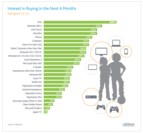 Terminé les vieux jouets en bois, le vélo de course ou la Barbie, les enfants d’aujourd’hui veulent des iPad. En effet, chez les enfants âgés de 6 à 12 ans, 48% répondent vouloir un iPad comme cadeau dans les six prochains mois. Juste après, on retrouve la Wii U, tout juste commercialisée par Nintendo, pour 39% des enfants.